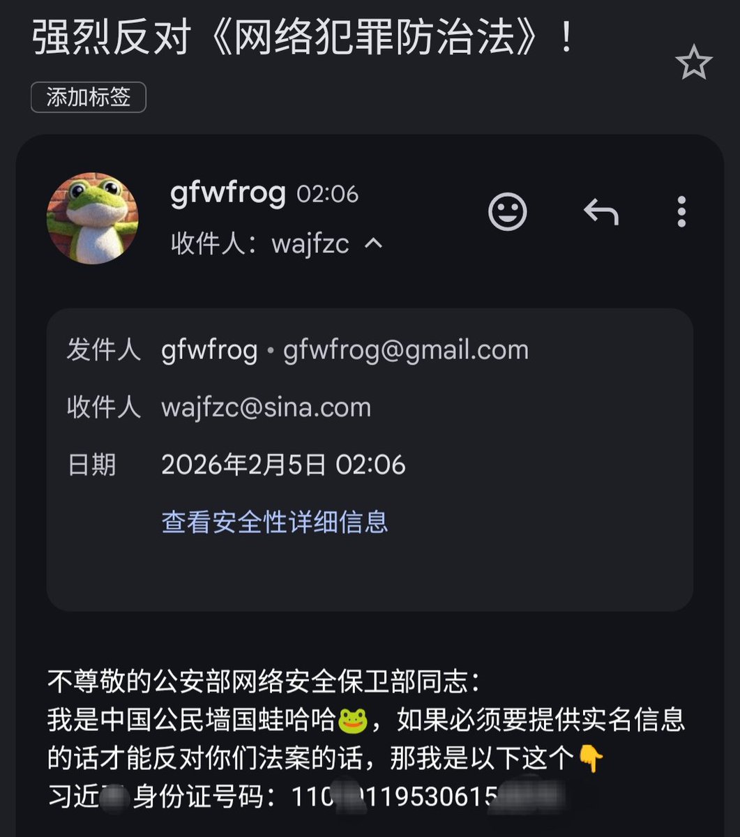 我通过公安部提供的邮箱wajfzc 提交我对《网络犯罪防治法(征求意见稿)》的反对意见了🐸