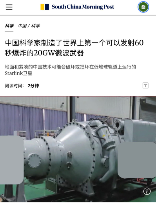 2月6日,南华早报报道,中国已经研制出针对星链的微波武器。