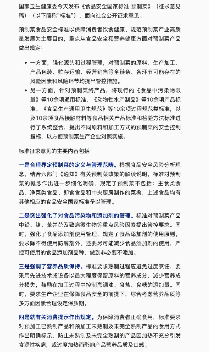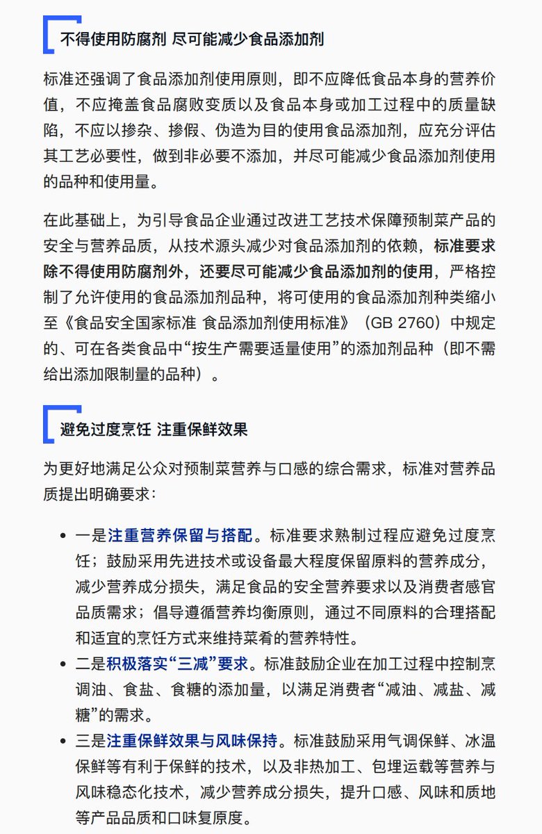 国家卫健委:预制菜不得使用防腐剂、保质期不应超一年,明确四类食品不属于预制菜,即主食类食品、净菜类食品、即食食品和中央厨房制作的菜肴。 尽可能使用减少食品添加剂,将可使用的食品添加剂种类缩小至《食品安全国家标准 食品添加剂使用标准》(GB 2760)中规定的、可在各类食品中“按生产需要适量使用”的添加剂品种(即不需给出添加限制量的品种)。