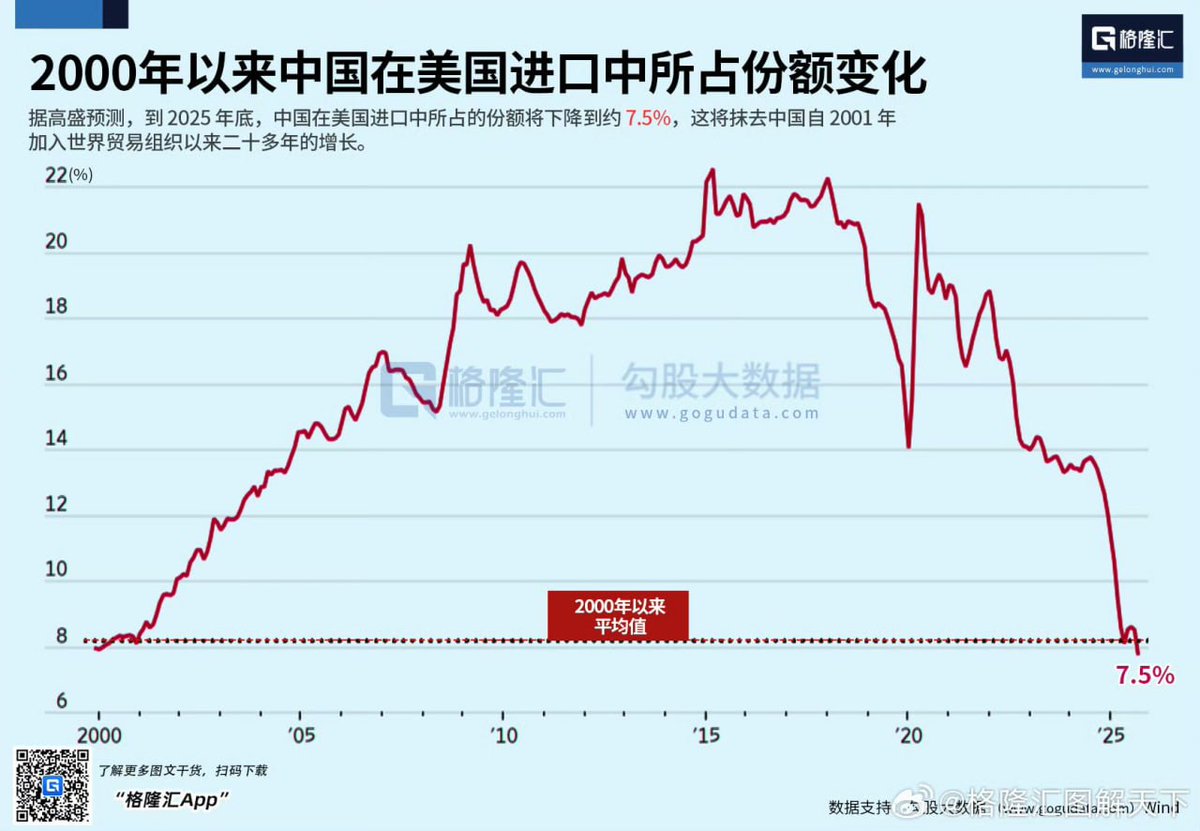 中国在美国进口中所占份额将下降到约7.5%,抹去了2001年之后加入WTO之后二十多年的增长。