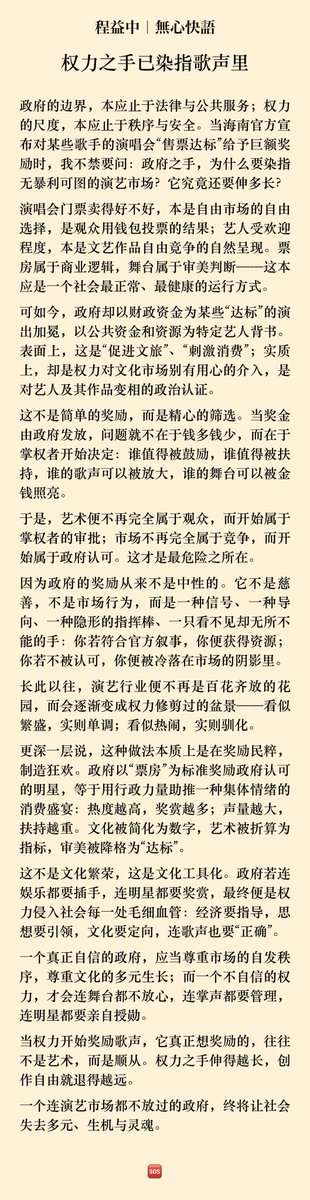 当权力开始奖励歌声,它真正想奖励的,往往不是艺术,而是顺从。权力之手伸得越长,创作自由就退得越远。一个连演艺市场都不放过的政府,终将让社会失去多元、生机与灵魂。