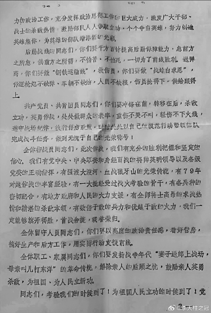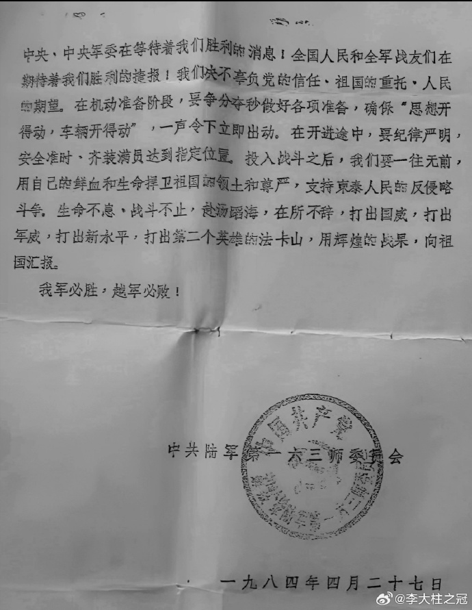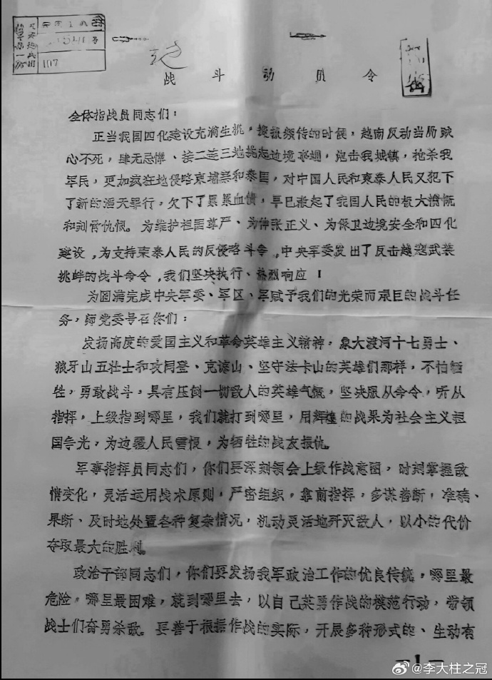@李大柱之冠: 罕见的历史文件:1984年,战斗动员令。 全体指战员同志们: 正当我国四化建设充满生机,捷报频传的时候,越南反动当局贼心不死,肆无忌惮、接二连三地挑起边境事端,炮击我城镇,枪杀我军民,更加疯狂地侵略柬埔寨和泰国,对中国人民和柬泰人民又犯下了新的滔天罪行,欠下了累累血债, 早已激起了我国人民的极大愤慨和刻骨仇恨。为维护祖国尊严、为伸张正义、为保卫边境安全和四化建设,为支持柬泰人民的反侵略斗争。
