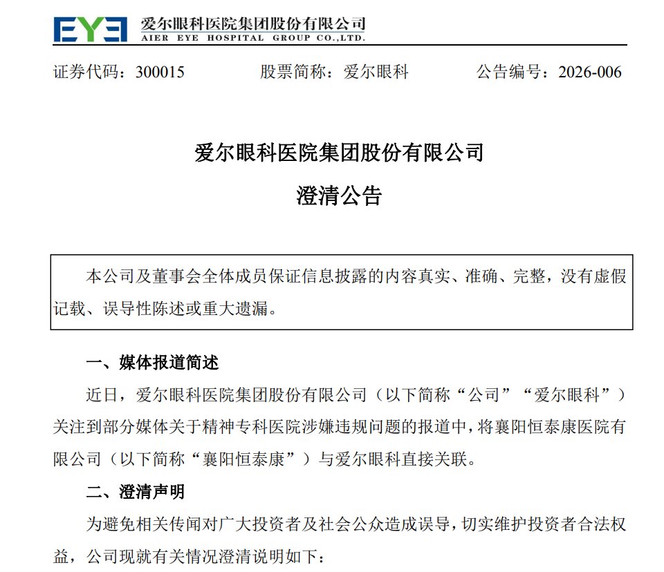 2月6日,爱尔眼科方面作出回应称,网络流传信息与事实不符,公司及董事长本人均未参与、亦未实际控制涉事精神病院的运营管理。