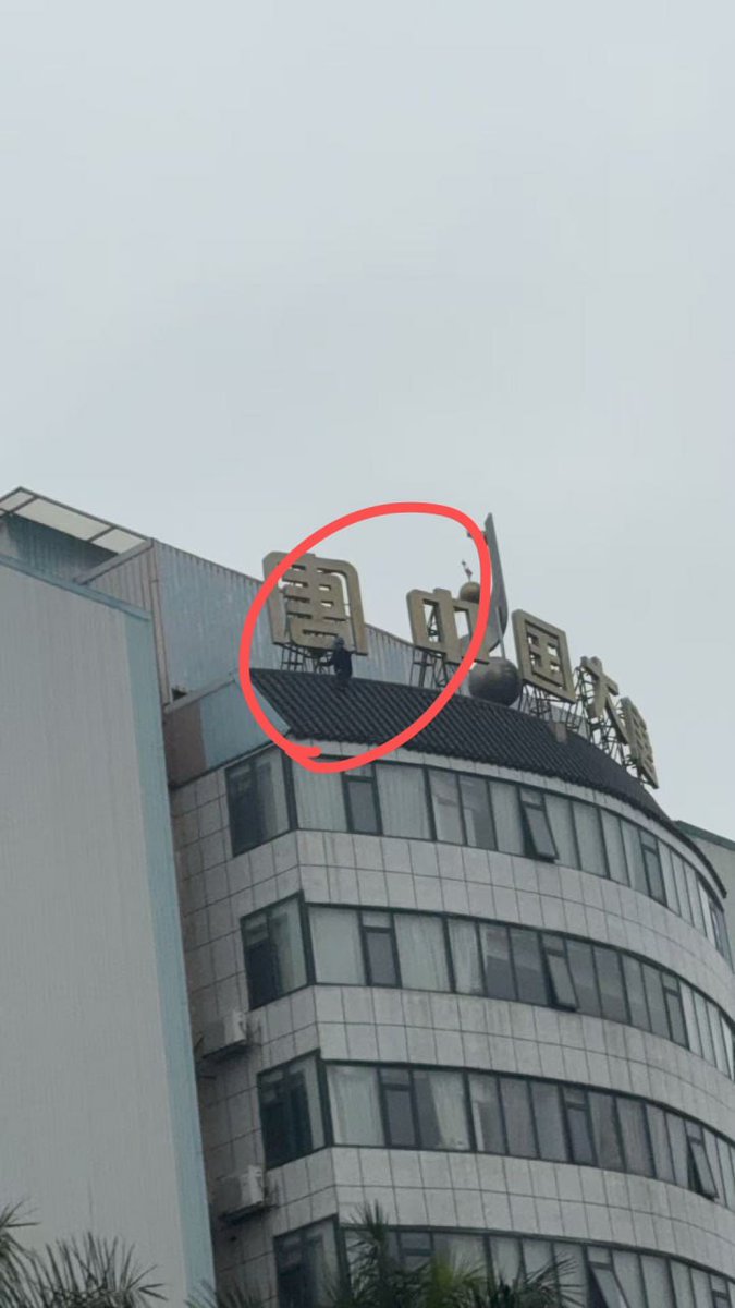 2月5日,广西。一名讨薪人员爬上楼顶维权。
