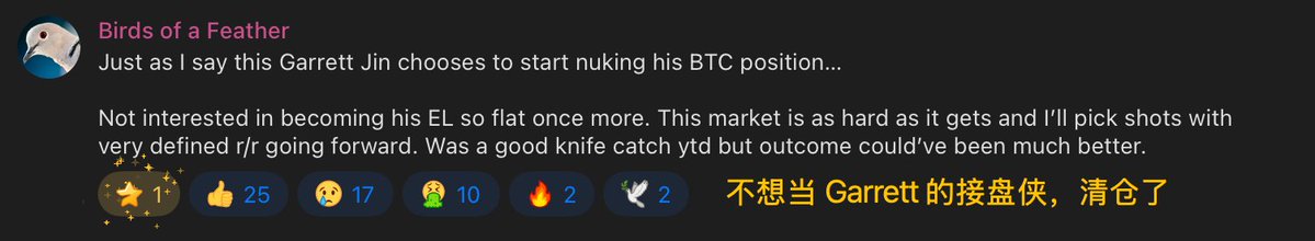 六小时前还在唱多,现在就清仓离场了 —— 他表示 Garrett(爆仓 2.3 亿美元的 1011 巨鲸) 开始砸盘,不想成为他的接盘侠,所以选择离场