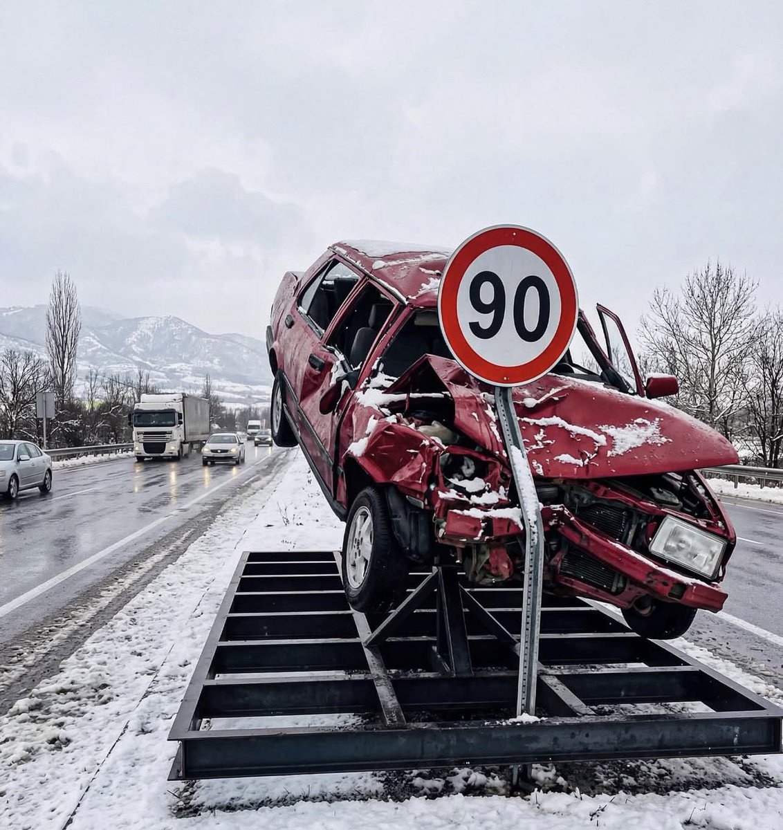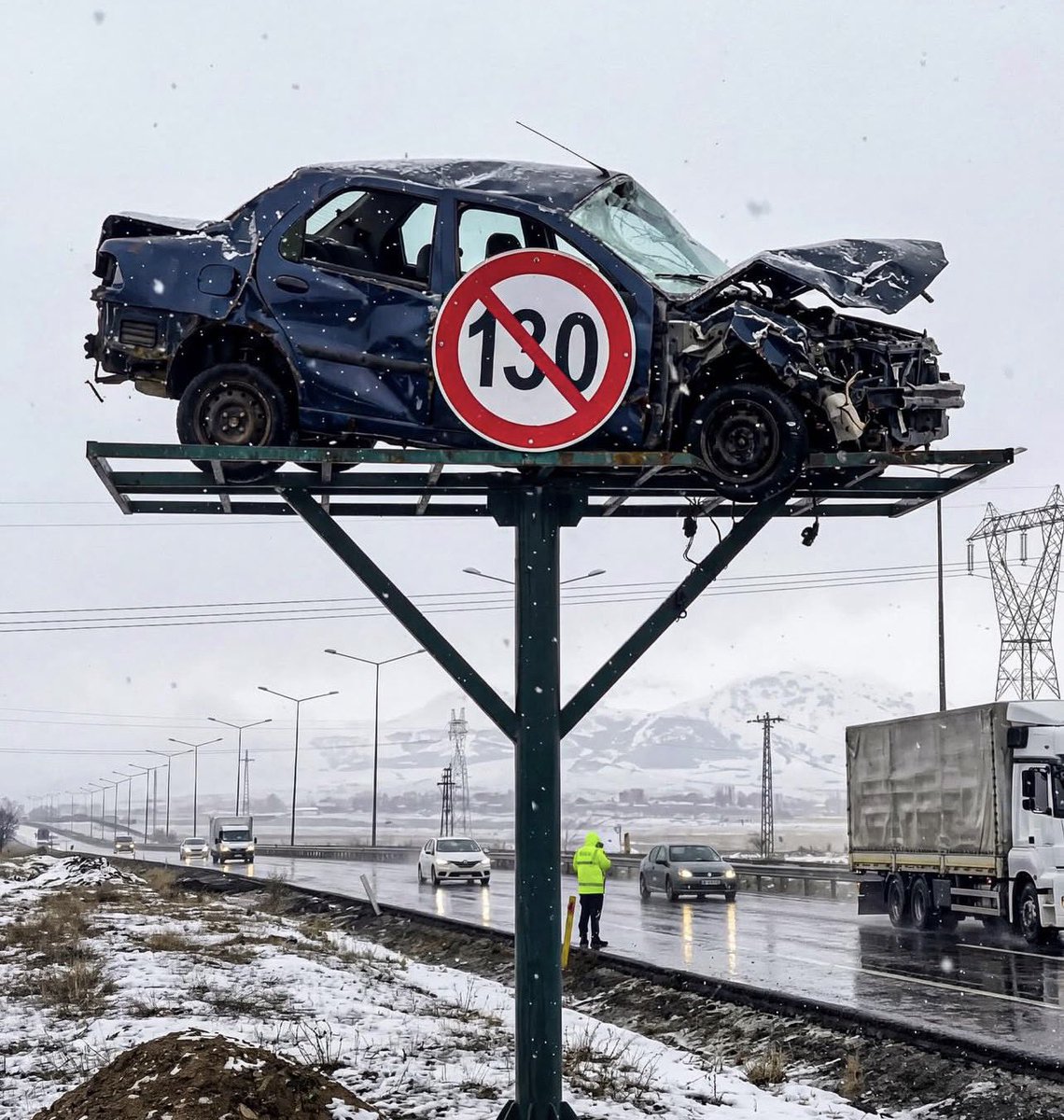 In Turkey, they are using wrecked cars for speed signs.