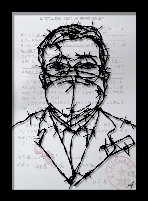 唯獨李文亮醫生留下了姓名,那是他2020年1月3日,因為4天前(2019年12月30日),他在微信群“武漢大學臨床04級”發了“華南和水果海鮮市場發現7例SARS”,和一張檢測報告,一張患者肺部CT圖,隨後補充說:“最新消息是冠狀病毒感染確定了,正在進行病毒分型”;最後解釋了冠狀病毒的由來。被作為”不實“言論,被傳喚到武漢市公安局武昌分局中南路街派出所,接受警方訓誡後在訓誡書上的簽名,名字上還讓按上紅手印。警方在訓誡書里白紙黑字警示他:"如果你固執己見,不思悔改,繼續進行違法活動,你將會受到法律的制裁!你聽明白了嗎?"他必須在“答”字後邊寫上:“明白”,也得按上紅手印。