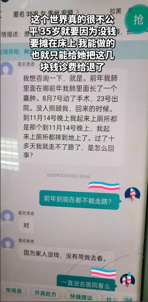 “真实的贵州:35岁女子瘫痪两年多,因无钱就医” 2月6日,一名来自贵州的35岁女子在线咨询医生时讲述了自己的遭遇。 她表示,自己因肺部长囊肿,于2023年8月接受手术治疗。 出院后,同年11月在家中上厕所时不慎摔倒,十天后便逐渐无法行走。 医生追问:“从前年到现在一直都不能走路吗?” 女子无奈回复:“因为家里没钱,一直没有带我去医院检查治疗。” 听完她的讲述,医生不禁感慨:“这个世界真的很不公平,35岁就因为没钱看病而瘫痪在床。”最终,他能做的只有默默退还了这次的诊费。