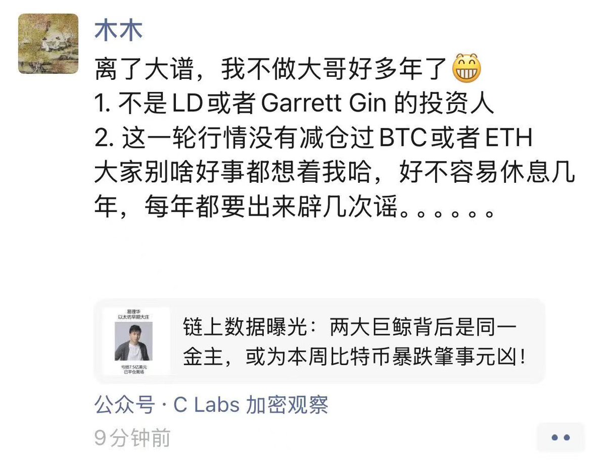 火币创始人李林亲自发文辟谣,表示自己并非 LD 和 Garrett Gin 的投资人,本轮行情中也未减仓比特币或以太坊。