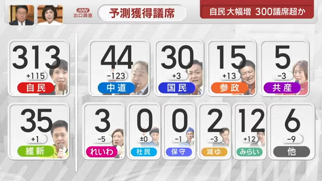 高市早苗获得历史性大胜,以316票,68%的议席拿下众议院(图为出口民调,不是最终结果)。自民党虽然是日本第一大党,但自创建以来也没有拿过那么高的票数。比如安倍晋三时代是其强势期,票数也只是61%。