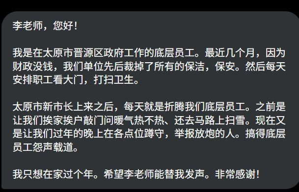 太原市晋源区政府员工投稿:太原市新市长上来之后,没日没夜折腾底层员工,不仅辞退了所有保洁和保安,现在又让所有工作人员过年期间在街上蹲守,举报燃放烟花爆竹的群众。