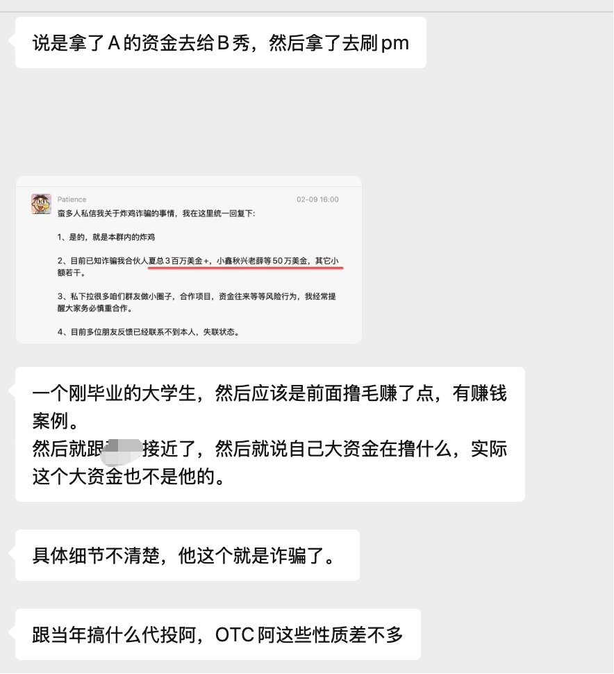 昨天今天看到这个小孩代刷诈骗几 M(据说有 10M)的情况,还是有点意外的,因为有些投了钱的兄弟也是自己有工作室的老鸟,结果还被这小孩套路了。