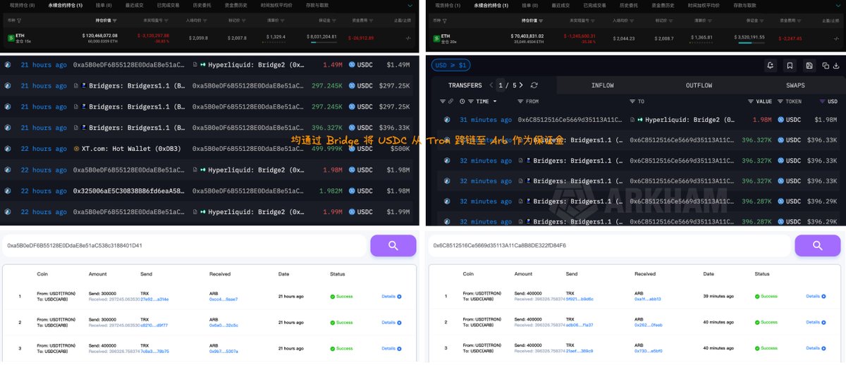 奇怪,又是一个从 Tron 网络提取资金做多 $ETH 的地址,巧合?🤔两个地址现已累计做多超 9.5 万枚 ETH,总价值高达 1.9 亿美元,为 Hyperliquid ETH 多头 TOP1&TOP2 仓位🔸地址 0x6C8…D84F6 过去 3 小时向 Hyperliquid 充值 2179.8 万枚 USDC 的保证金,随后开启 35,164.2 枚 ETH 20x 多单(7050