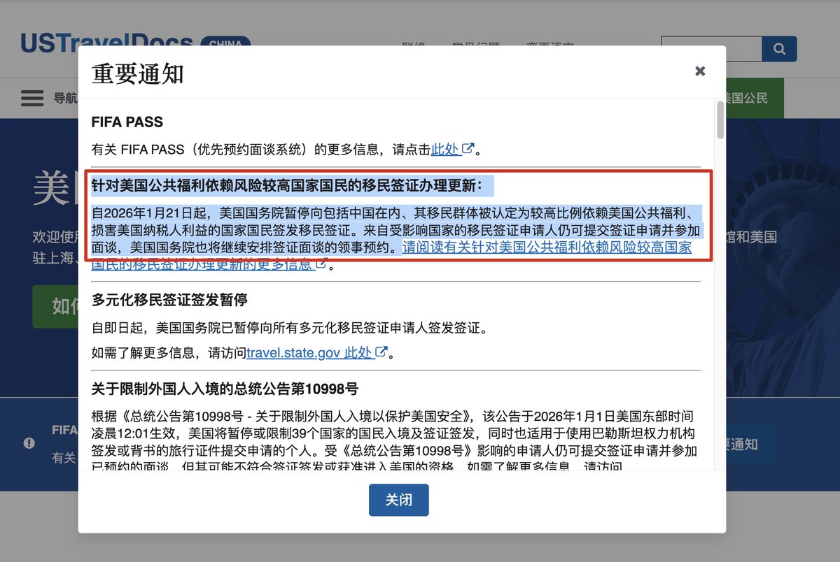 1月14日,美国国务院宣布,无限期暂停向 包括中国在内的 部分国家公民发放移民签证。