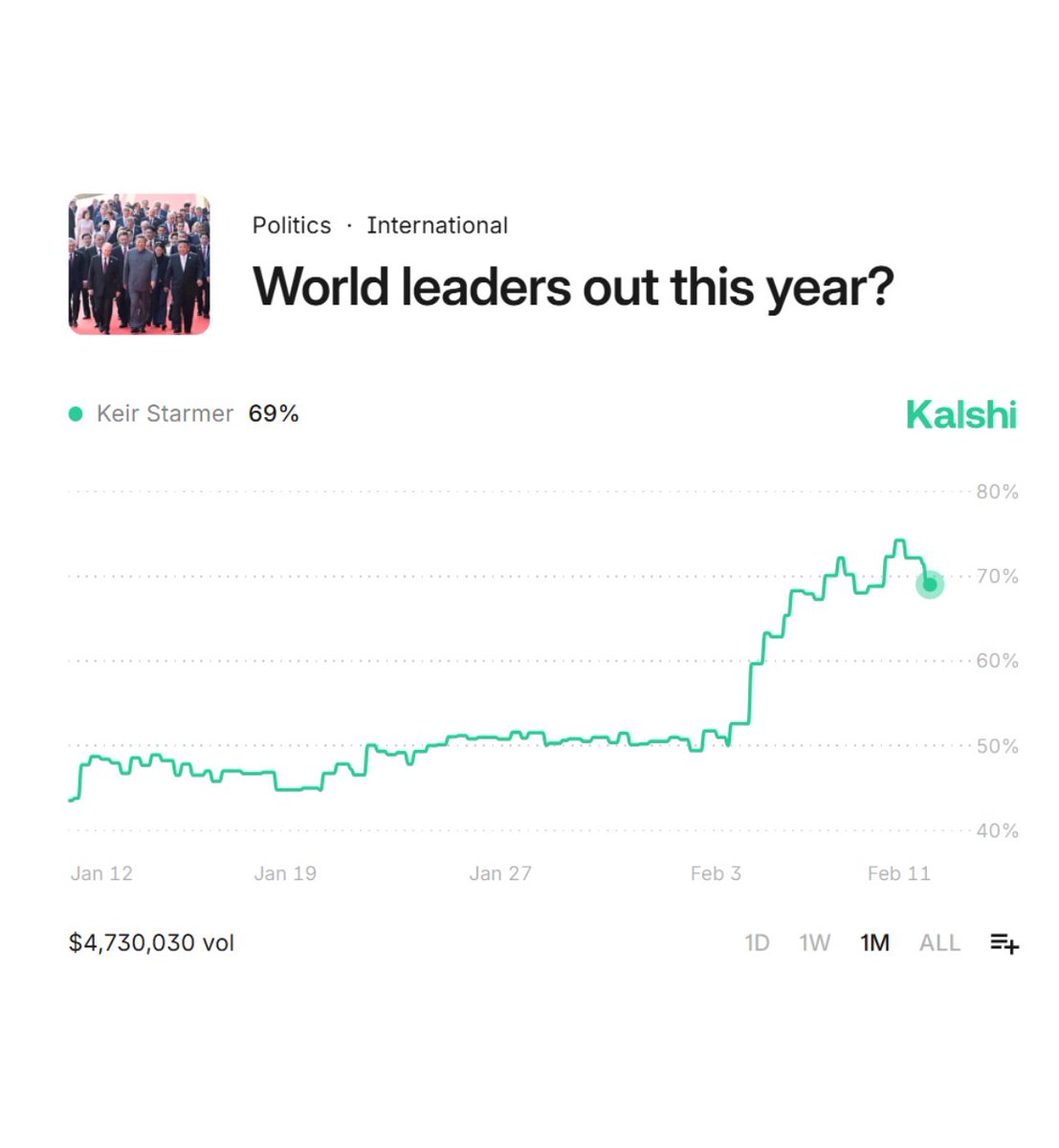 Chances of 🇬🇧 United Kingdom's Prime Minister Keir Starmer being out of power this year are 69% according to prediction market.