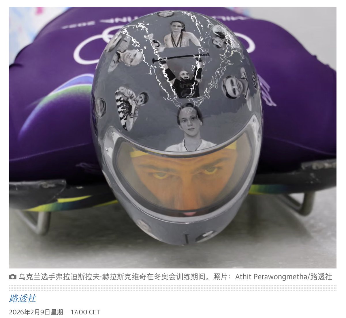 在2026冬奥会场馆训练时,乌克兰雪车选手 弗拉迪斯拉夫·赫拉斯凯维奇 佩戴“记忆头盔”,头盔上有被俄罗斯杀害的乌克兰运动员图像。