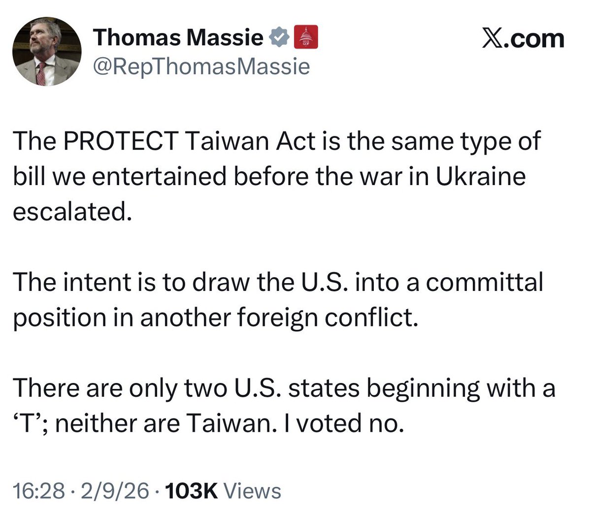 昨天眾議院壓倒性多數通過《保護台灣法案》。在愛潑斯坦案引人注目的共和黨籍眾議員馬西是兩位投反對票的議員。馬西專門發貼文強調兩個理由:1)這不符美國優先,為他國打仗。2)支持台灣如同支持烏克蘭,沒有必要。