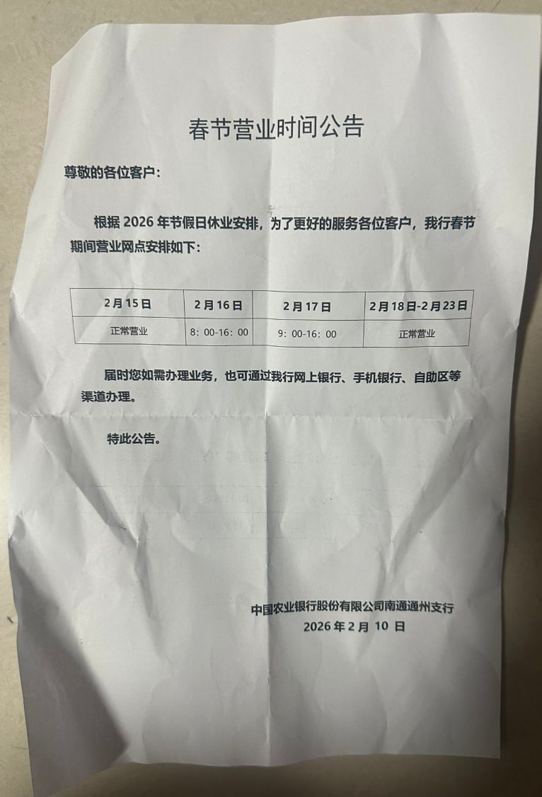 网友投稿:中国农业银行 南通通州支行,要求员工过年上班,且没有加班工资