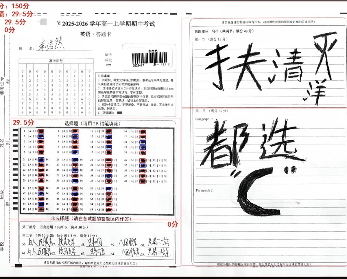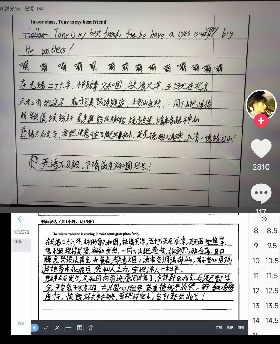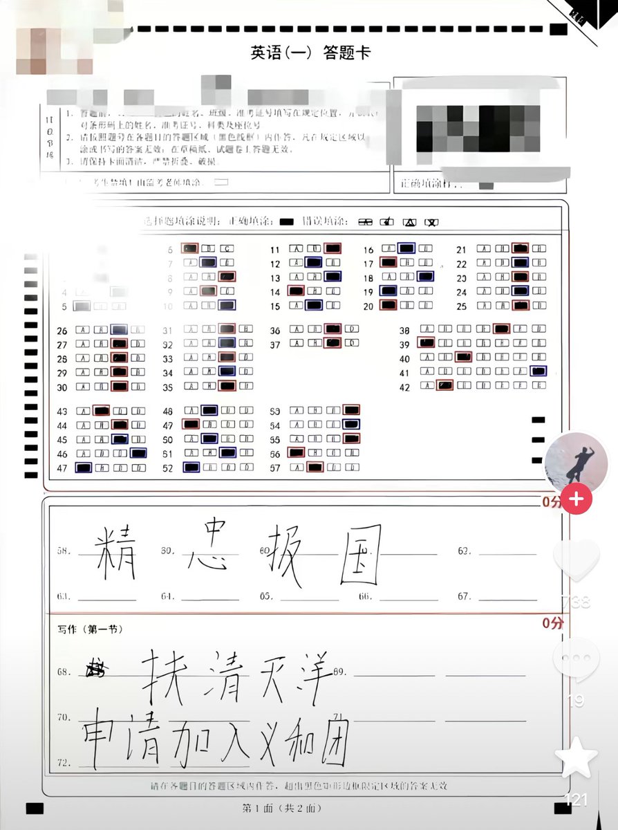 近日,国内一些初中生和高中生之间开始流行一种现象:只要在英语试卷上遇到不会写的题目,便干脆写下清末光绪年间义和团“扶清灭洋”的口号。