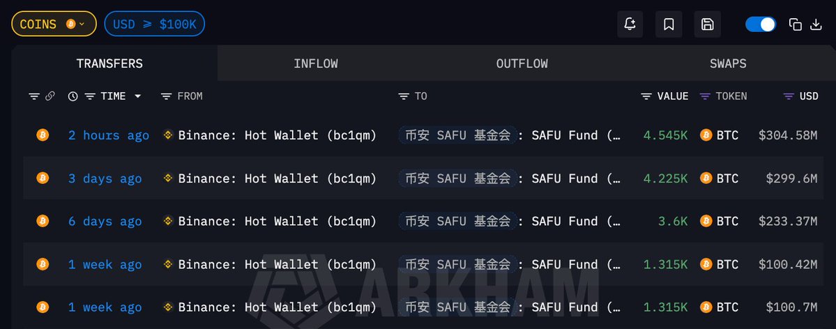 币安 SAFU 基金于 2 小时前完成了最后一笔 4545 $BTC 的购入,约 3 亿美元;至此 02.02 - 02.12 期间已累计买入 15000 枚 BTC,按 10 亿美元折算平均成本约 $66,666.66,好家伙这吉利的数字…