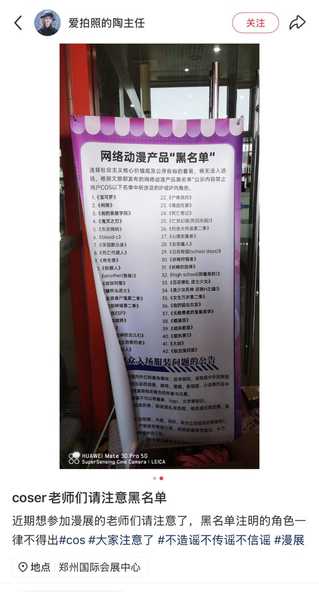 2月11日,河南漯河。一名coser晒出了竖立在漫展门外的“网络动漫产品黑名单”告示牌,上面密密麻麻列举了42个日本动漫名字。