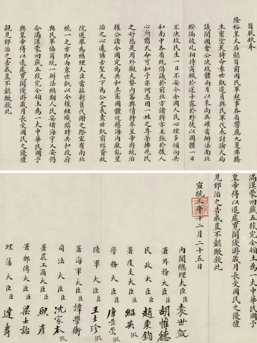 清朝颁布了退位诏书,结束了清朝268年的统治和数千年的中国君主制历史。