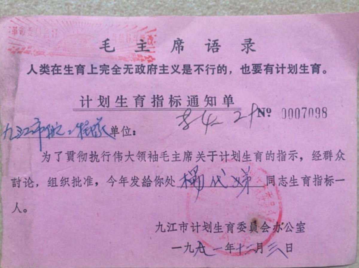 发给杨代娣同志生育指标一人。这张照片的印刷时间是1971年,说明早在1971年,计划生育就开始了。