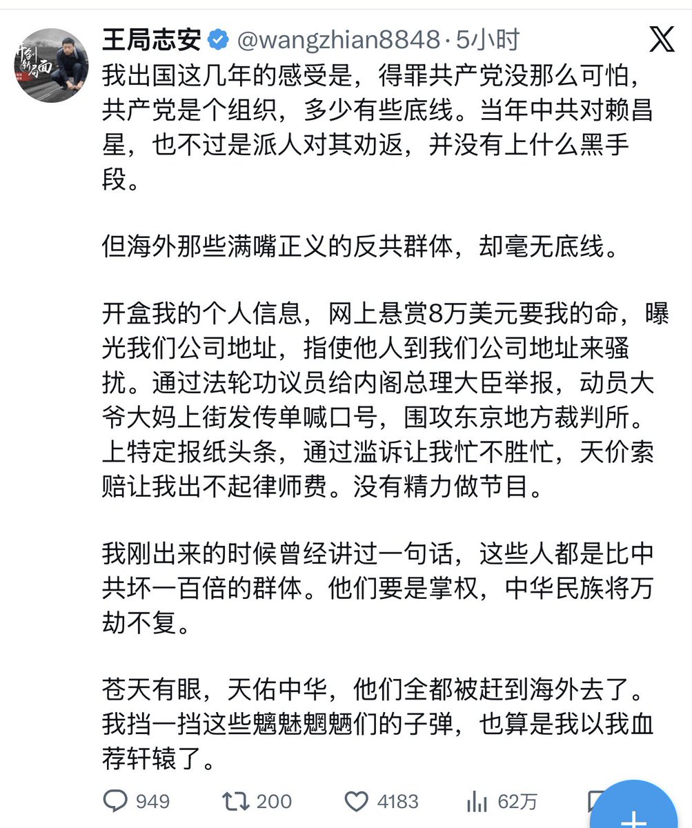 第一,他在持续性地弱化中共的制度性海外镇压,把国家机器的系统性压迫,降格为“多少有些底线的组织行为”。这种表述本身,就是对邪恶暴政的美化。任何了解中共跨国施压措施的人都知道:中共对海外异议人士的家属连坐迫害、经济封锁、情报渗透、舆论抹黑、司法诉讼、甚至跟踪暗杀都毫无“底线”可言!王以赖昌星为例,首先就混淆了赖昌星的本质,赖是经济犯罪嫌疑人逃亡海外,并非反共人士。中共当年逼赖昌星回国,主要采取的是长期外交施压、司法博弈和政治谈判,而不是公开可证实的暴力手段。1999年赖昌星逃往加拿大后,中国持续十多年通过外交渠道交涉、提交补充证据、出具“不判死刑、不施酷刑”的书面保证,围绕人权风险与遣返合法性在加拿大法院反复博弈。案件焦点始终在“遣返后是否会被判死刑、是否会遭受不人道待遇”。最终加拿大法院在审理后认定中方承诺具有约束力,2011年将其遣返。(请注意,是遣返,不是王志安说的劝返)回国后赖昌星被判无期徒刑,未被判死刑。赖昌星逃亡海外后从“超级富豪”到几乎身无分文,正是中共残酷海外镇压的典范。中共通过无穷无尽的司法诉讼,通过巨额律师费和保释安保费用是使赖“坐吃山空”。公开资料中没有证据显示对其实施暗杀或跨国暴力行动。但这并不意味着“宽容”或“有底线”。这是一场典型的国家级追逃行动:在西方法治框架内,通过外交压力、法律消耗和政治承诺,实现战略目标。因此,这个案例更准确的描述是——策略性克制,而非道德性克制;制度博弈,而非仁慈退让。