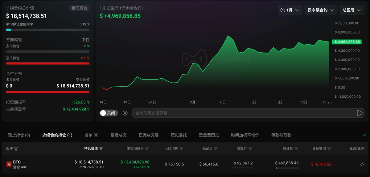 他从 02.02 起做空 BTC,目前持有 278.76 BTC 的 40x 空单(约 1851 万美元),开仓均价 $75,150.5