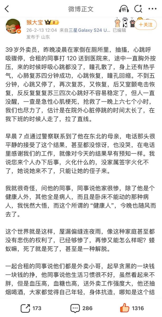 2月13日,山东急诊医生“猴大宝”分享了昨天急诊救治一名猝死外卖员的经历,他感慨:像这种家庭已经没有悲伤的权力了。蝼蚁死了就是死了,甚至是一种解脱