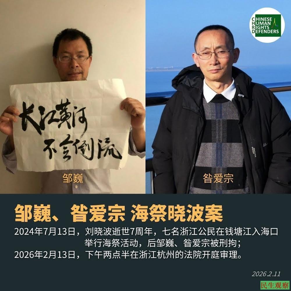 #中国人权 #每日一推 #良心犯 之250期:邹巍被判有期徒刑3年6个月、昝爱宗被判有期徒刑3年。2026年2月13日下午杭州拱墅区法院开庭审理此案,只因在海边私人、和平且小范围方式悼念诺贝尔和平奖获得者刘晓波,两位公民却被以涉嫌“寻衅滋事”遭此重判,中共再为侵犯与践踏公民自由与人权添一例罪证