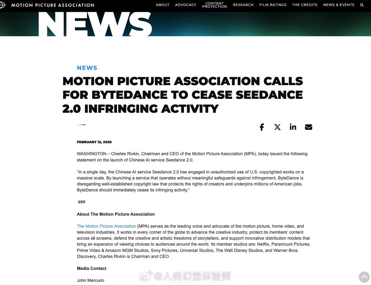 在反日情绪的渲染下,在互联网近日流传起AI制作的 “ 奥特曼 VS高市早苗” 和 “柯南 对战高市早苗” 的视频。 2月13日,日本的动漫电影文化协会 NAFCA 已经发出声明,就版权问题向字节跳动在日本的 TikTok 公司发出问询。 2月12日,美国电影协会(MPA)发表声明,强烈谴责字节跳动无视版权法,要求其立即停止Seedance2.0 的侵权行为。