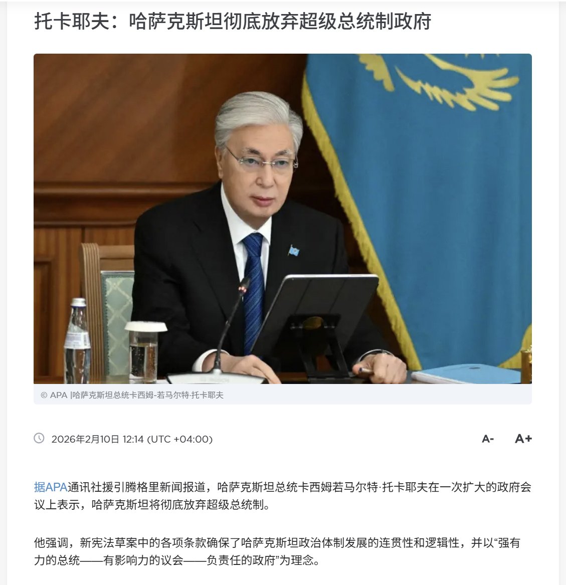 2月10日,哈萨克斯坦总统托卡耶夫在一次政府扩大会议上表示,哈萨克斯坦正在完全放弃收苏联模式影响到、高度集权的超级总统制的治理模式,把权力让渡给议会。