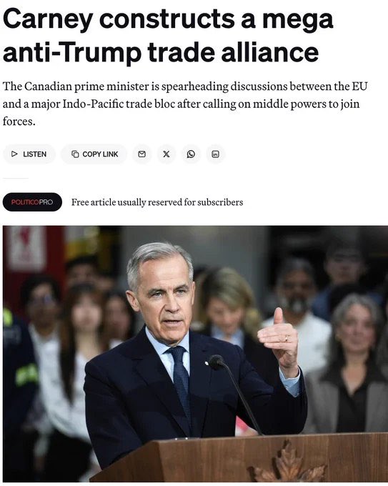 加拿大总理卡尼正在推动建立欧盟与印太地区的重大贸易联盟,以应对川普时代的关税威胁和“贸易战胁迫”。