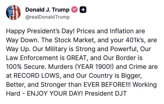 川普总统发表总统日致辞,称美国物价与通胀大幅下降,股市与401k账户飙升。他强调边境已实现100%安全,犯罪率降至历史最低,国家比以往任何时候都更强大。