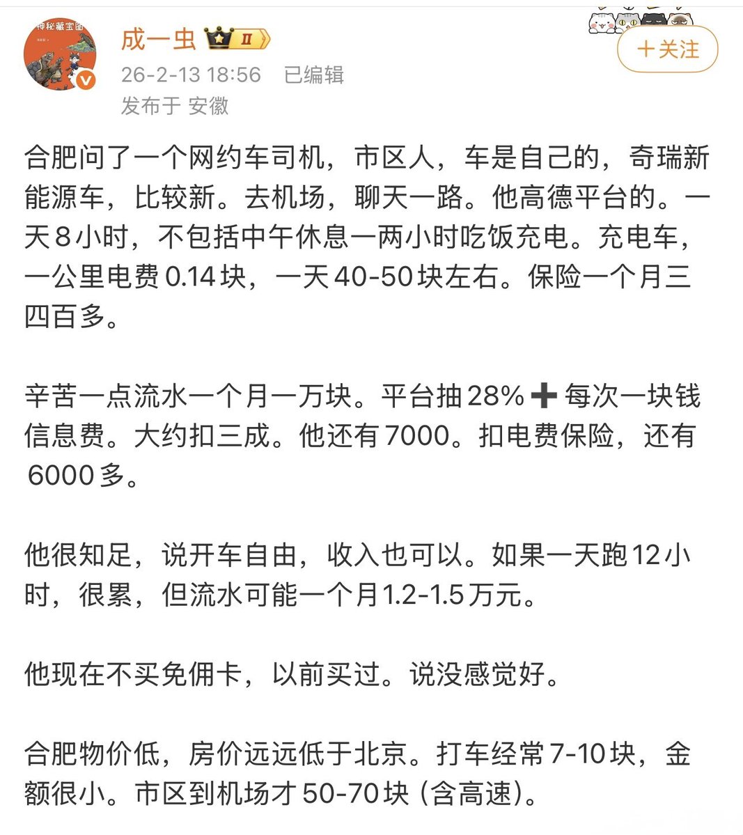 合肥网约车司机,车是自己的,奇瑞新能源车,每天工作12个小时,每月赚6000块,你认为收入怎么样?