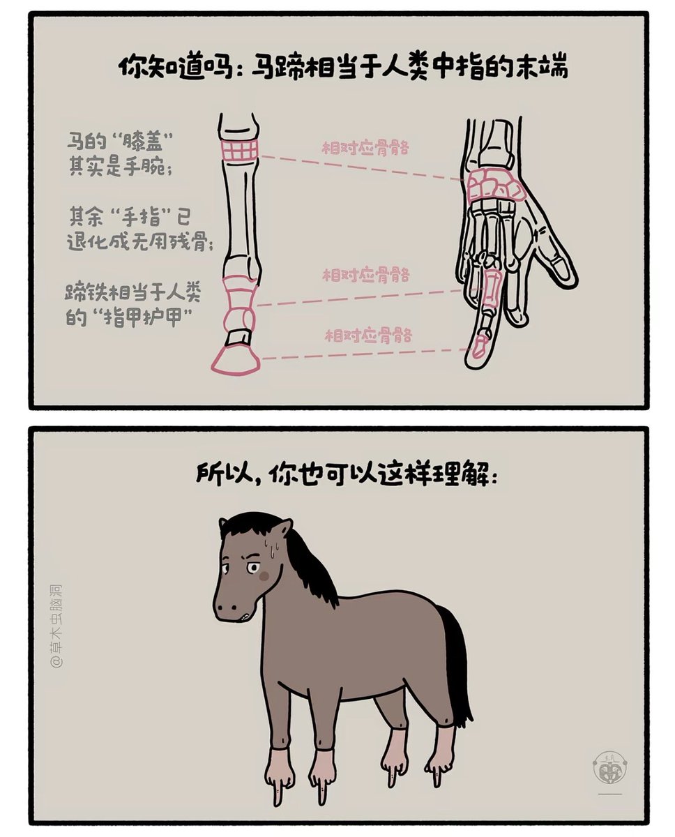 原先马有三个脚趾头,后来为了更快地奔跑以求生存,慢慢地只剩下中趾着地发力。
