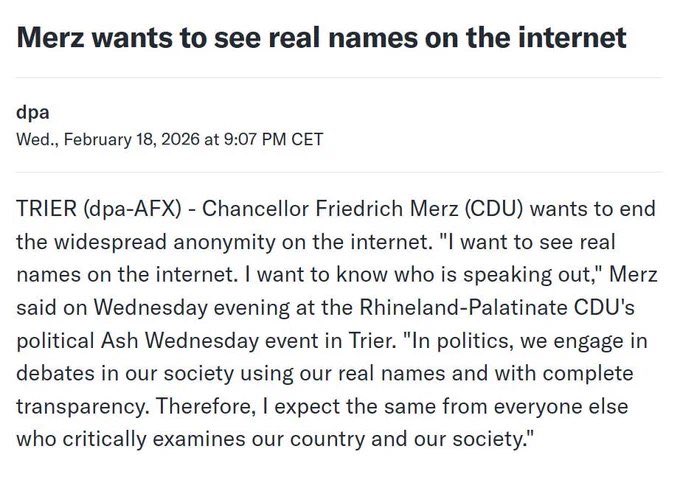 德国总理默茨曾任贝莱德集团前主席,他提议取消网络匿名制,并表示:“我希望看到真实姓名。”