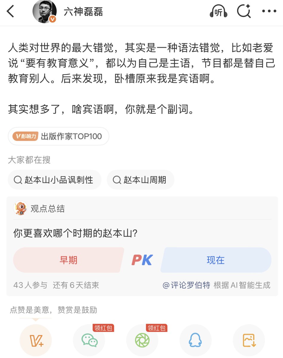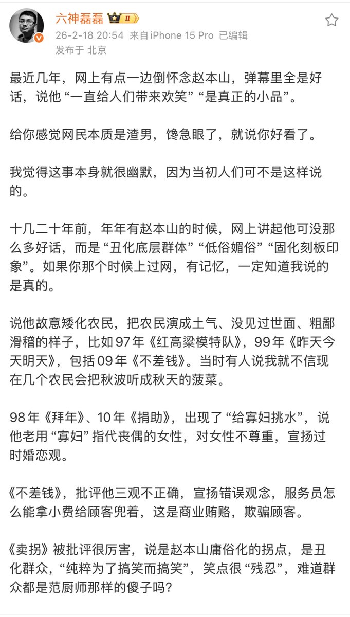 “六神磊磊”表示,即便赵本山现在复出,他当年的语言、段子、人物设定,在今天的平台审核、舆论氛围下,可能“活不过五集”。