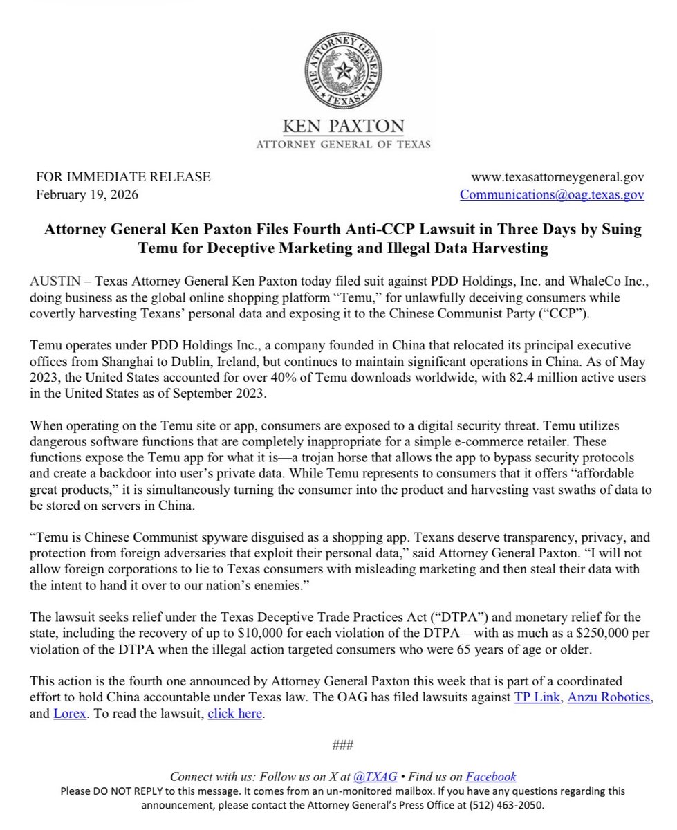 三天内,我将提起第四起反中共诉讼,起诉Temu公司进行欺骗性营销和非法数据收集。