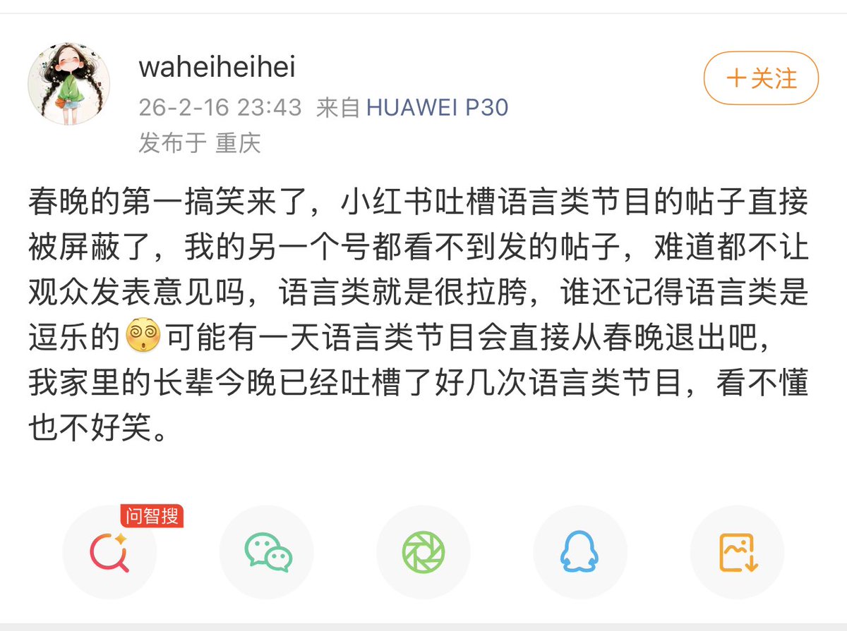 近日,多名网友反映,他们在社交平台上发布吐槽春晚的帖子,最后都会被平台下架或做屏蔽处理。