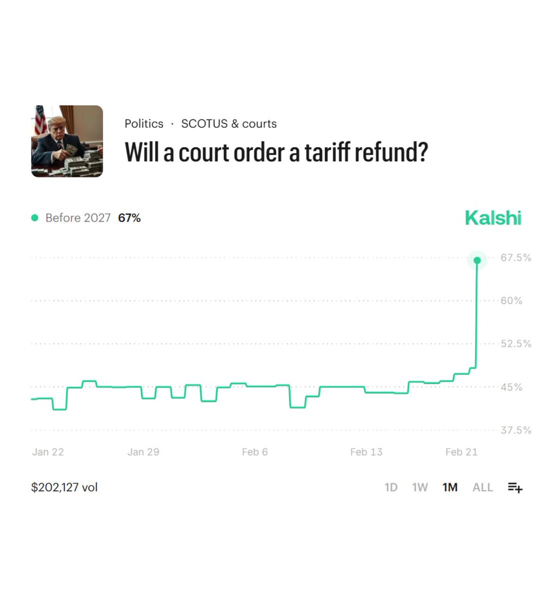 UNITED STATES: Chances of the US Supreme Court ordering refund of tariff revenue by end of year surges to 67% according to prediction market.