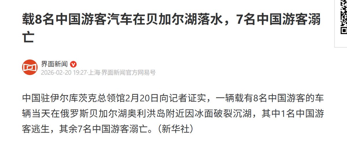 2月20日,中国驻伊尔库茨克总领馆 向记者证实,一辆载有8名中国游客的车辆,当天在俄罗斯贝加尔湖奥利洪岛附近,因冰面破裂沉湖,其中1名中国游客逃生,其余7名中国游客溺亡。
