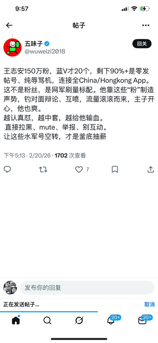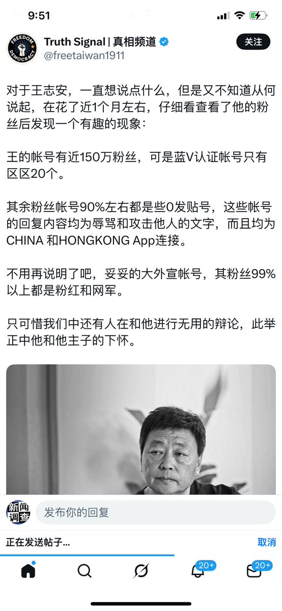 海外华人圈油管和推特几个头部号都是大外宣,中共引领海外华人舆论阵地。真相传媒:对于王志安,一直想说点什么,但是又不知道从何说起,在花了近1个月左右,仔细看查看了他的粉丝后发现一个有趣的现象:王的帐号有近150万粉丝,可是蓝V认证帐号只有区区20个。