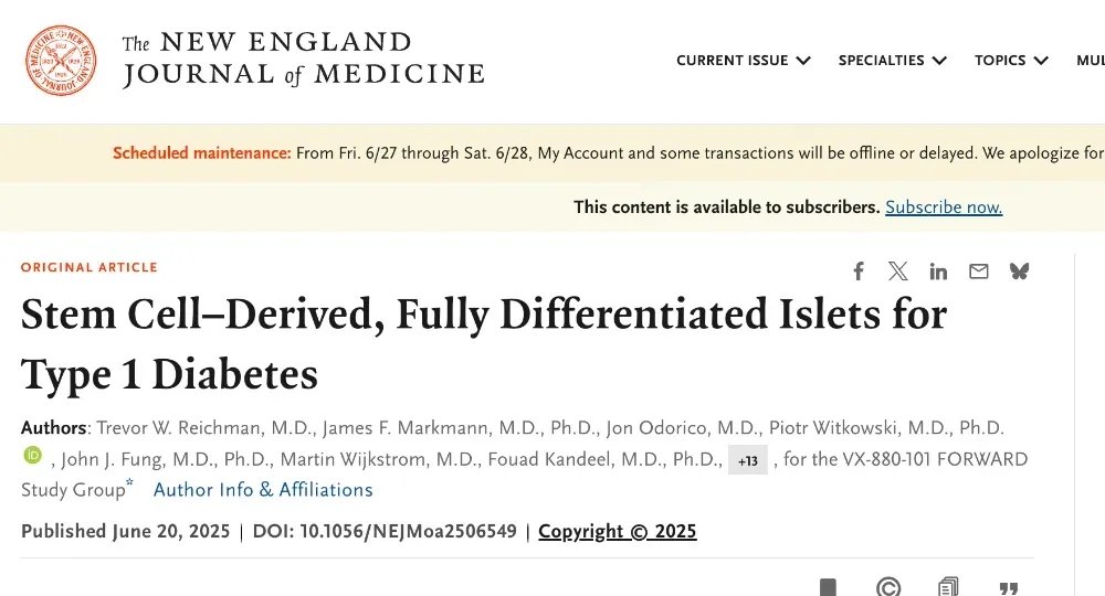这一研究成果被誉为糖尿病治疗领域的里程碑。该疗法由全球生物制药巨头Vertex Pharmaceuticals(福泰制药)研发,目前已经进入关键的III期临床试验阶段,公司透露最快有望在 2026年正式申请上市。