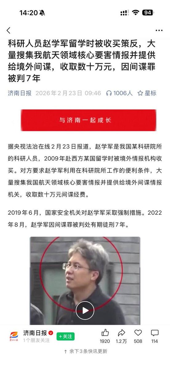 2月23日,据央视法治在线报道,科研人员赵学军在2009年前往某西方国家留学期间,被境外情报机构拉拢策反。此后其多次搜集航天领域核心敏感信息并向境外间谍提供,从中收取数十万元报酬,因犯间谍罪被依法判处有期徒刑7年。