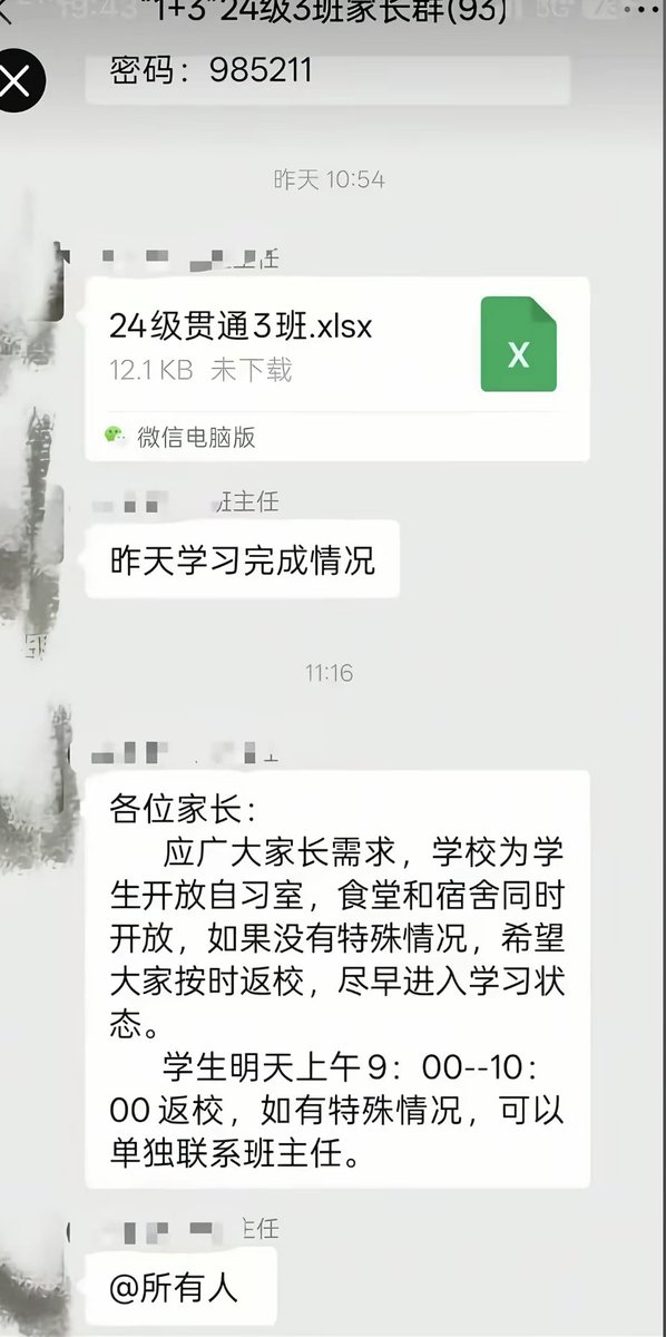 图片显示,有老师在班级群内通知称:“明天(25日)返校,应广大家长需求,学校为学生开放自习室,食堂和宿舍同时开放,希望大家按时返校,尽快进入学习状态。”