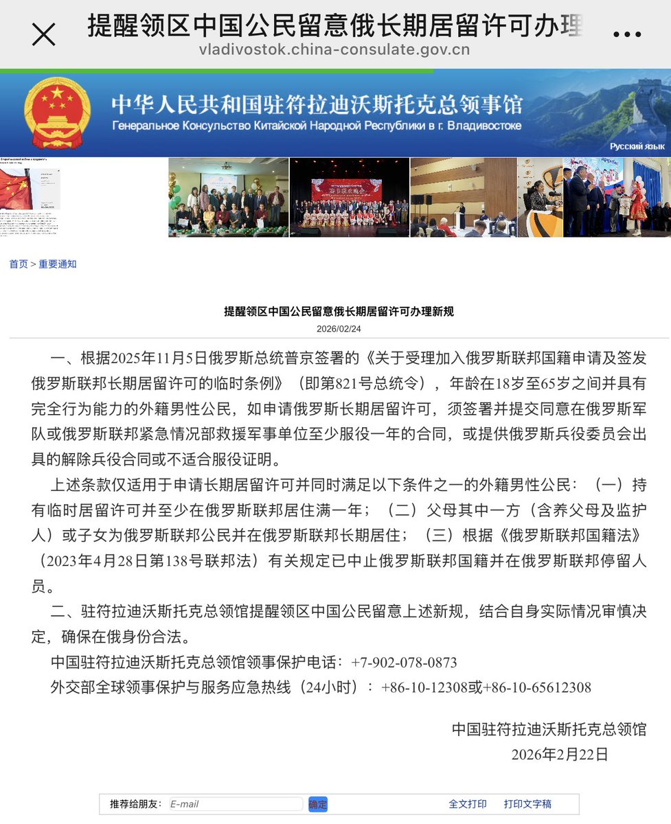 2月22日,中国驻俄罗斯符拉迪沃斯托克总领事馆提醒:年龄在18岁至65岁之间并具有完全行为能力的外籍男性公民,如申请俄罗斯长期居留许可,须签署并提交同意在俄罗斯军队或俄罗斯联邦紧急情况部救援军事单位至少服役一年的合同。