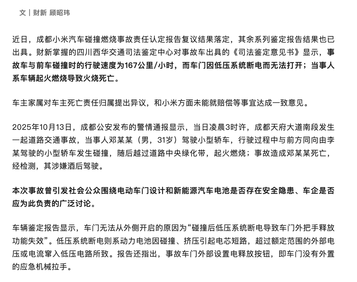 财新报道,四川西华交通司法鉴定中心对成都小米碰撞燃烧事故车出具的《司法鉴定意见书》显示,事故车与前车碰撞时的行驶速度为167公里/小时,而车门因低压系统断电而无法打开;当事人系车辆起火燃烧导致火烧死亡。