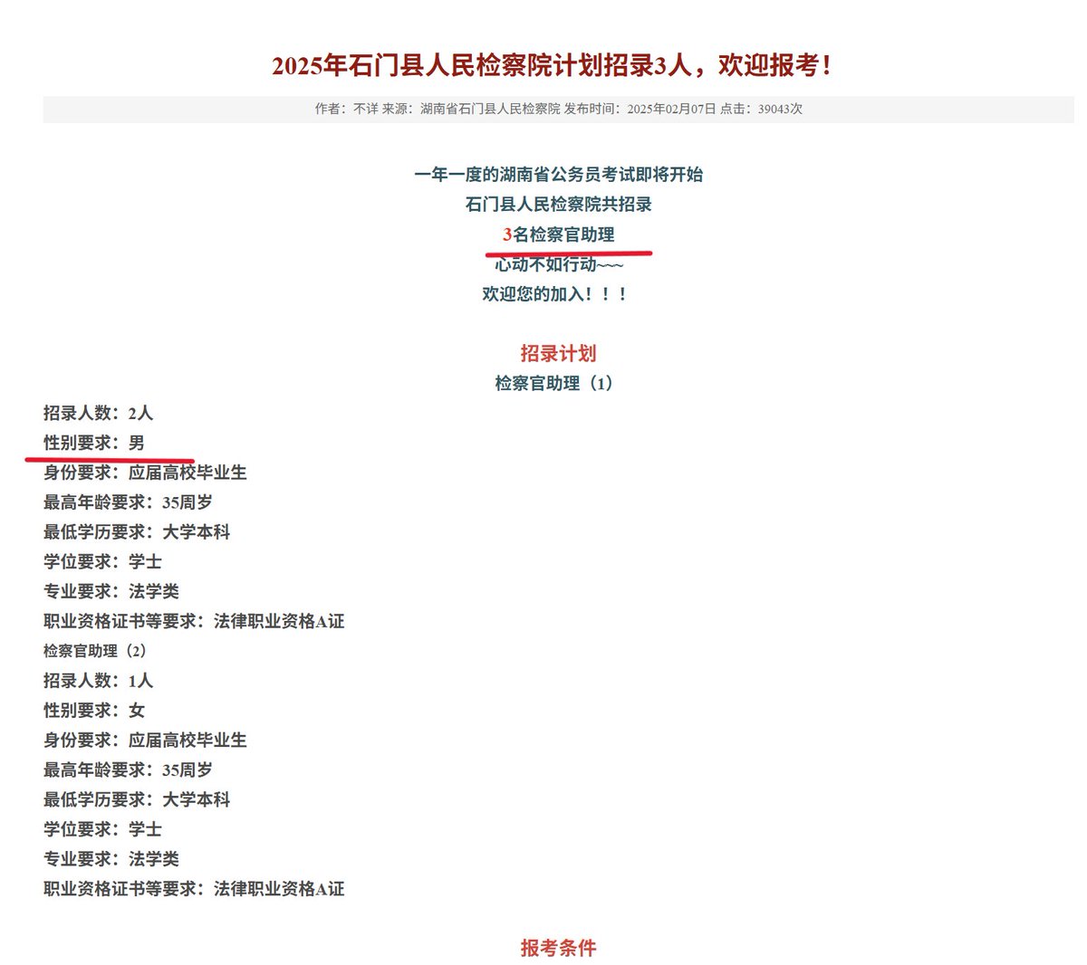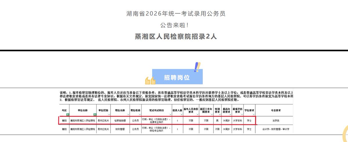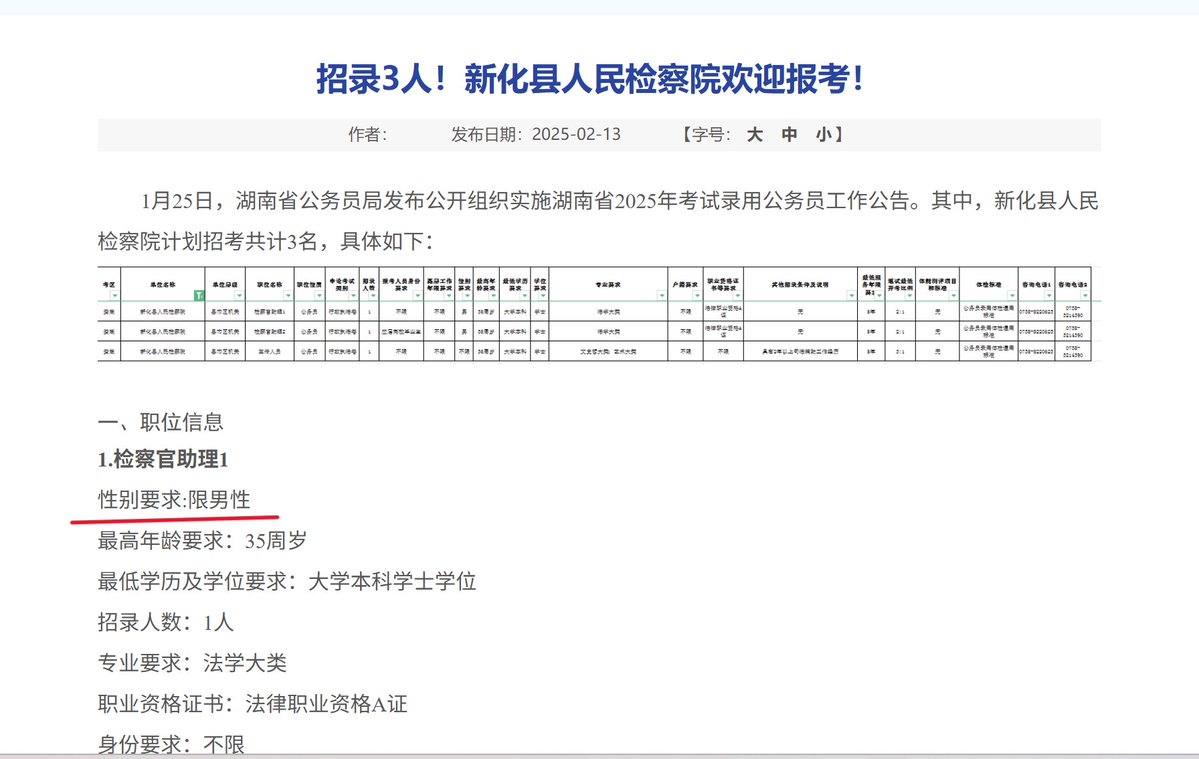 整治招聘性别歧视,应该从公权力自己开始 据公开资料显示,2026年1月,蒸湘区人民检察院发布的一则招聘公告中,其中一个岗位明确要求“仅限男性”。2025年1月,新化县人民检察院发布的招聘信息中共设三个岗位,其中两个岗位标注为“仅限男性”。 2025年2月,石门县人民检察院此前发布的招聘要求中,也对岗位性别比例作出限定,提出“二男一女”的用人安排。